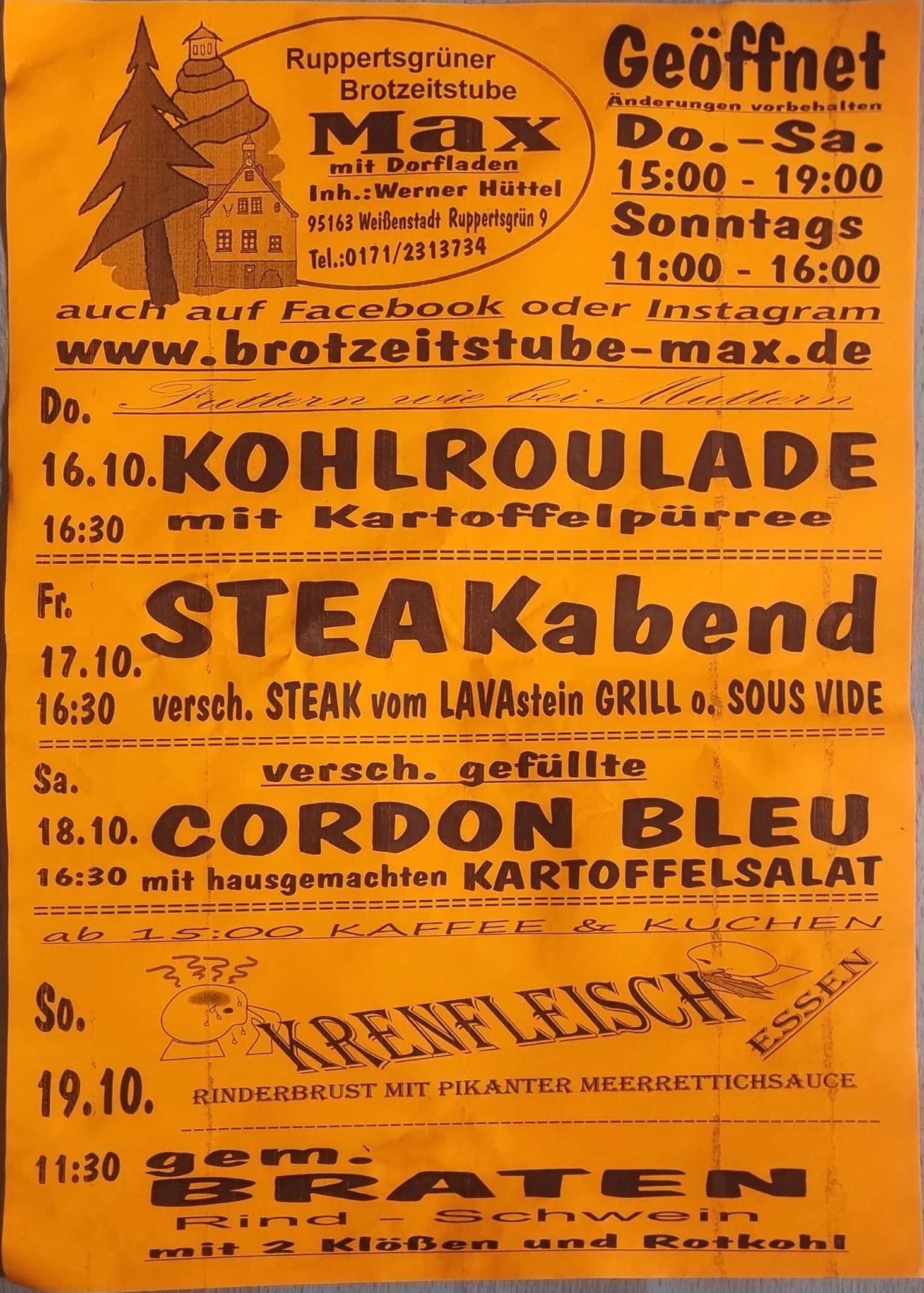 Do. 16.10 ab 15.00 Uhr geöffnet ab 16.30 Kohlroulade mit Pürree ### Fr. 17.10 ab 15.00 Uhr geöffnet ab 16.30 Uhr STEAKABEND Roastbeef Sousvide oder Rip Eye Steak ect. ### Sa. 11.10 ab 15.00 Uhr ab 16.30 Cordon bleu verschieden gefüllt ### So. 19.10 ab 11.00 bis 16.00 Uhr ab 11.30 KRENFLEISCH oder Gemischterbraten mit Klössen und Blaukraut ### Zu unseren Tagesangebot täglich ab 15.00 Uhr unsere reichhaltige Speisekarte #### Alle Speisen gerne auch Ausser Haus ### täglich Hausmachtes Gebäck ### ACHTUNG im Moment Sonntag ab 16,00 Uhr geschlossen