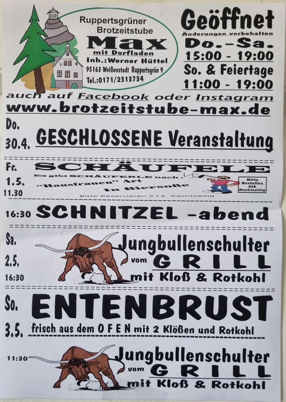 Ab 1.Mai Neue Öffnungszeiten: Küche bis 19.00 Uhr. Gaststätte bis 20.00 Uhr geöffnet. Jetzt auch wieder Sonntags bis 20.00 Uhr geöffnet! Do. 30.04 ab 15.00 Uhr geöffnet. ### Fr. 01.05 ab 11.00 Uhr geöffnet Schäuferle mit Klössen und Sauerkraut und vieles mehr ab 16.30 bis ca.19.00 Schnitzel Abend ### Sa. 02.05 ab 15.00 Uhr geöffnet ab 16.30 Jungbullenschulter vom Grill mit Klössen und Blaukraut ### So. 03.05 ab 11.30 Uhr Entenbrust mit Klössen und Blaukraut oder Jungbullenschulter mit Kössen und Blaukraut, natürlich auchSchnitzel #### zu den Tagesangebot gibt es natürlich auch unsere reichhaltige Speisekarte ### alle Speisen gerneauch Ausser Haus ###