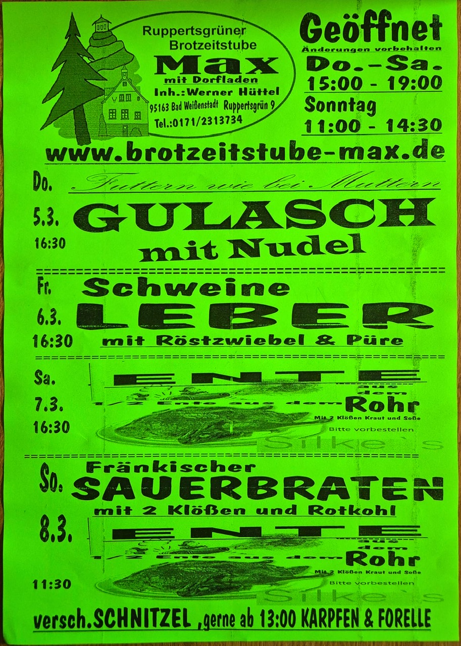 Do. 05.03 ab 15.00 Uhr geöffnet. Ab 16.30 Gulasch mit Nudel ####Fr. 06.03 ab 15.00 geöffnet. Ab 16.30 frische Schweine Leber mit Röstzwiebel und Kartoffelpürree #### Sa. 07.03 ab 15.00 Uhr geöffnet ab 16.30 1/2 Ente aus dem Rohr ### 08.03 ab 11.30 Uhr 1/2 Ente aus dem Rohr mit Klössen und Blaukraut oder Sauerbraten mit Klössen und Blaukraut natürlich auch diverse Schnitzel ### täglich zu unserenTagesangebot unsere reichhaltige Speisekarte ### alle Speisen gerne auch Ausser Haus ### Sonntag im Moment ab 14.30 UHR geschlossen