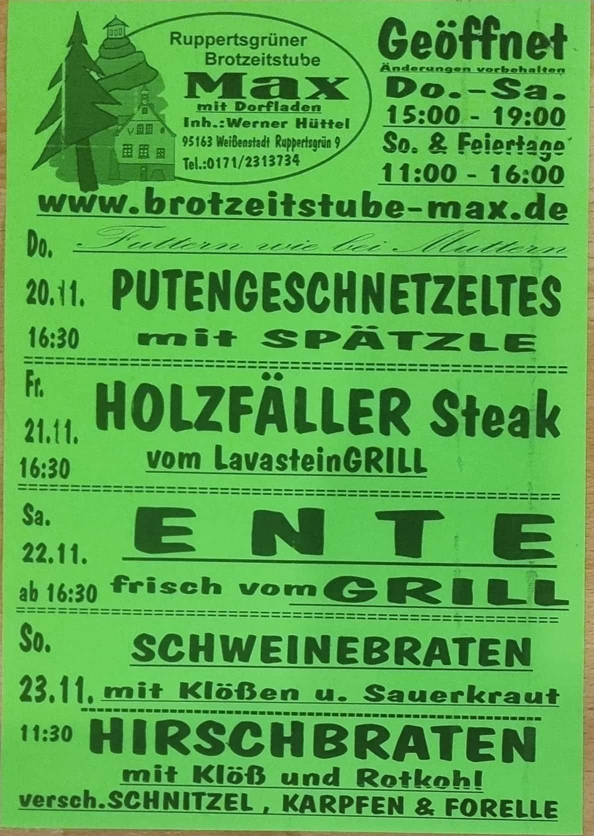 Do. 20.11 ab 15.00 Uhr geöffnet ab 16.30 Putengeschnetzeltes mit hausgemachten Spätzle ### Fr. 21.11 ab 15.00 Uhr geöffnet ab 16.0 Uhr Holzfäller- Steak ### Sa. 22.11 ab 15.00 Uhr geöffnet ab 16.30 Uhr Grill-Ente mit Klöss oder Kartoffelsalat ### So. 23.11 ab 11.30 Hirschbraten mit Klössen und Blaukraut oder Schweinebraten mit Klössen und Sauerkraut und vieles mehr ### Achtung im Moment Sonntag ab16.00 Uhr geschlossen ### Zu unseren Tagesangebot täglich ab 15.00 Uhr unsere reichhaltige Speisekarte #### Alle Speisen gerne auch Ausser Haus ### täglich Hausmachtes Gebäck