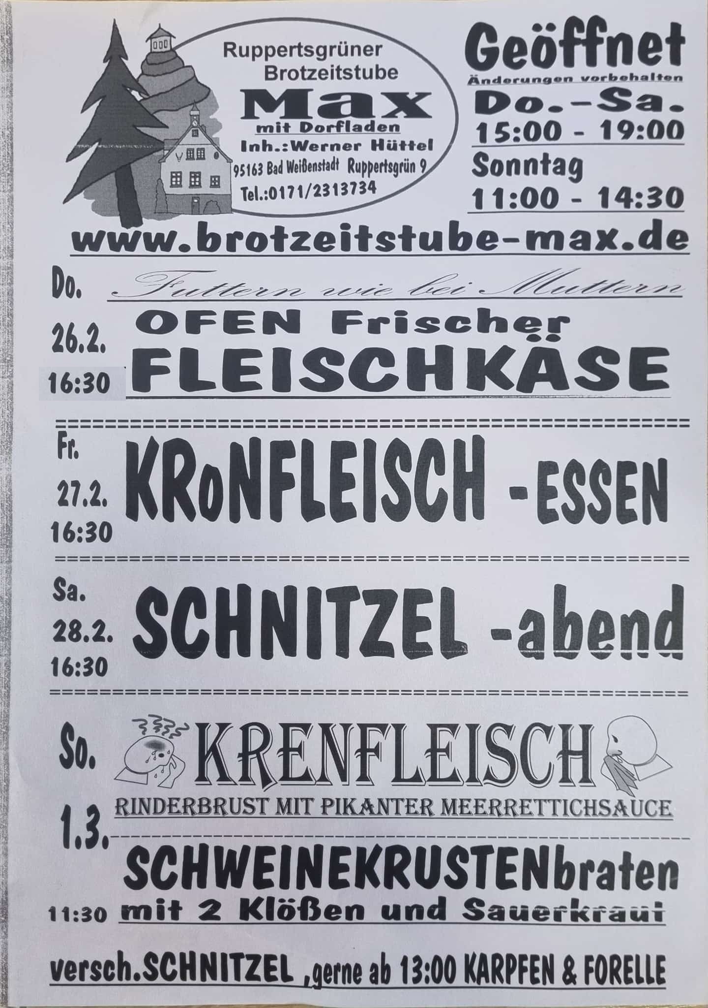 Do. 26.02 ab 15.00 Uhr geöffnet. Ab 16.30 Ofenfrischer Fleischkäse ####Fr. 27.02 ab 15.00 geöffnet. Ab 16.30 KRONFLEISCH Essen #### Sa. 28.02 ab 15.00 Uhr geöffnet ab 15.30 Schnitzel Abend ### 01.03 ab 11.30 Uhr Krenfleisch mit Klössen oder Schweine-Krustenbraten mit Klössen und Sauerkraut natürlich auch diverse Schnitzel ### täglich zu unserenTagesangebot unsere reichhaltige Speisekarte ### alle Speisen gerne auch Ausser Haus ### Sonntag im Moment ab 14.30 UHR geschlossen