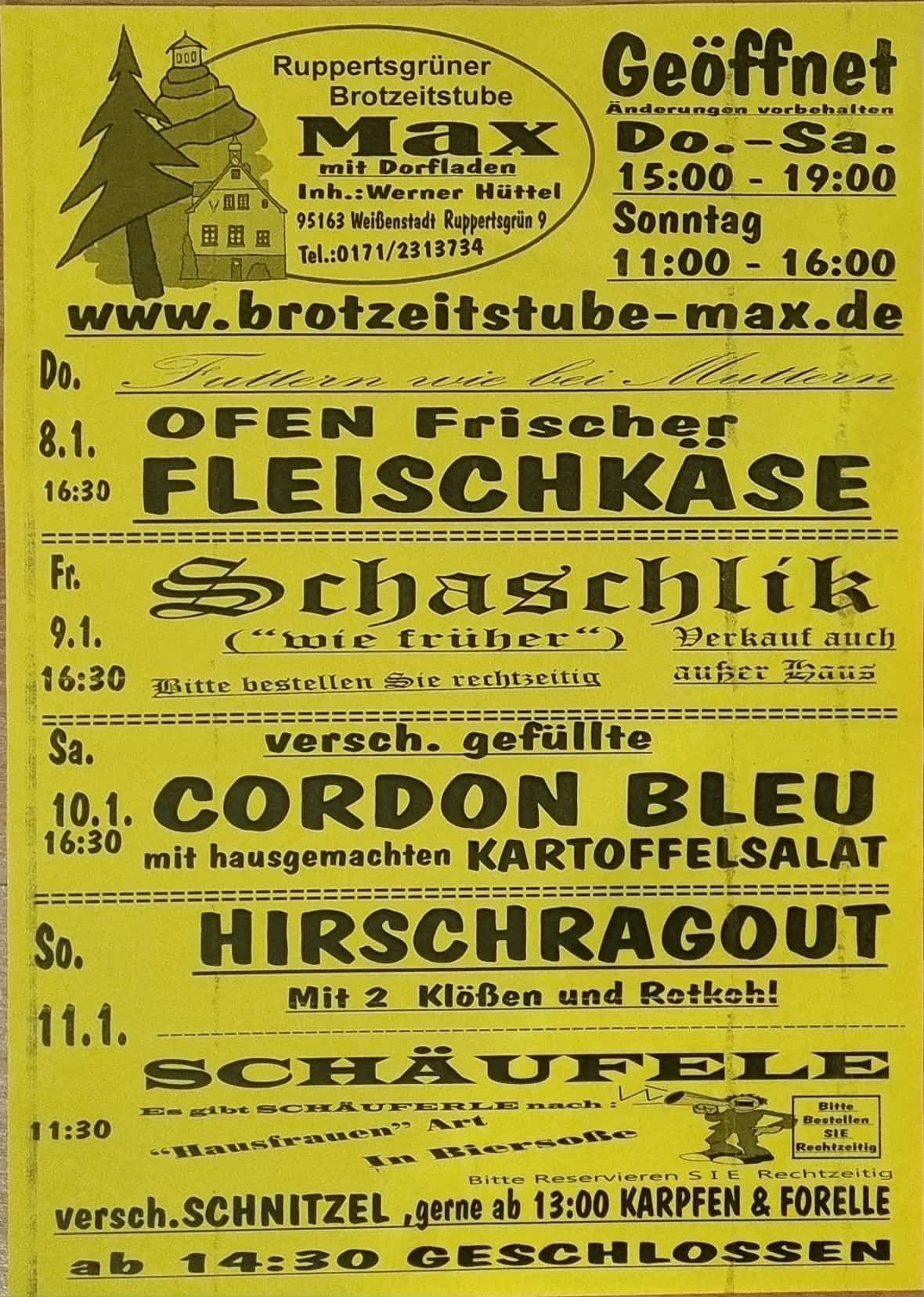 Fr. 09.01 ab 15.00 geöffnet ab 16.30 SCHASCHLIK ### Sa. 10.01 ab 15.00 geöffnet ab 16.30 verschieden gefüllte Cordon bleu ### So. 11.1 ab 11.00 Uhr geöffnet ab 11.30 Hirschragout mit Klössen und Blaukraut oder